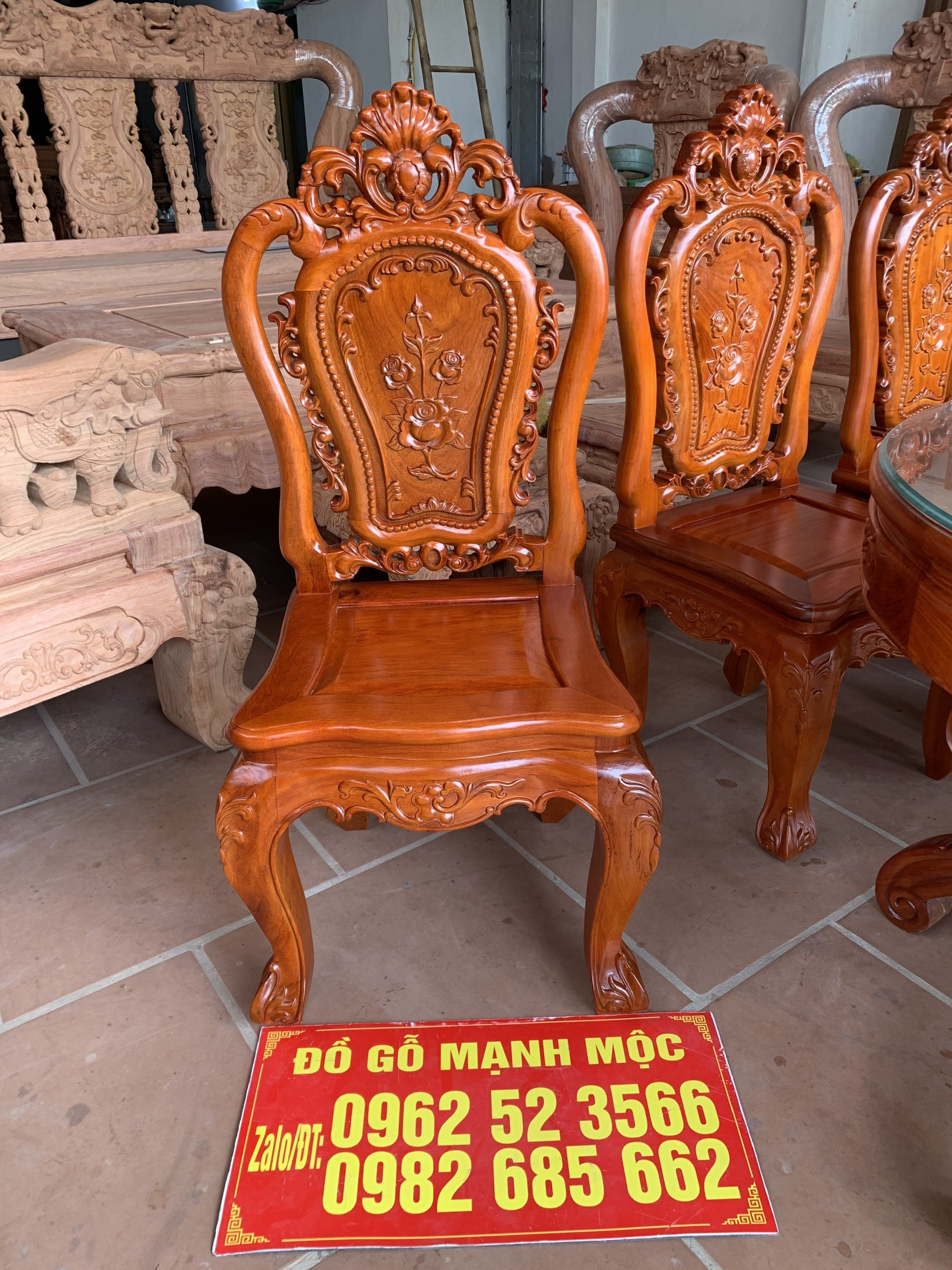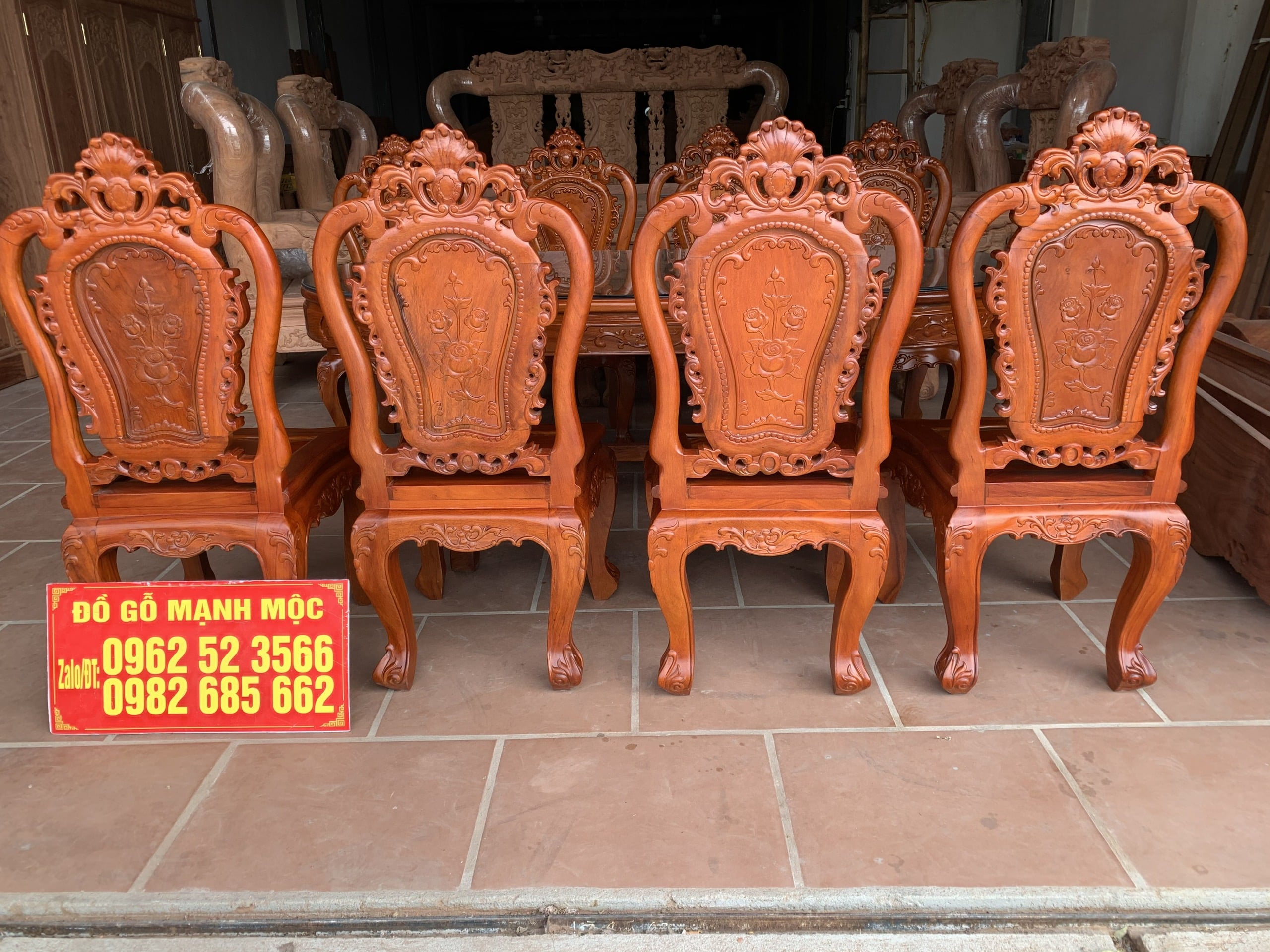 Bộ Bàn Ghế Ăn Hoa Hồng Đục 2 Mặt 8 Ghế Gỗ Gõ Đỏ